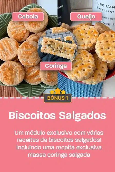 Um módulo com várias receitas salgadas. isso mesmo, além das receitas doces você também vai aprender receitas salgadas Nada de ingredientes mirabolantes. Receitas fáceis incluindo a minha receita secreta! Com a minha receita secreta você vai fazer mais de 10 sabores usando apenas uma massa.